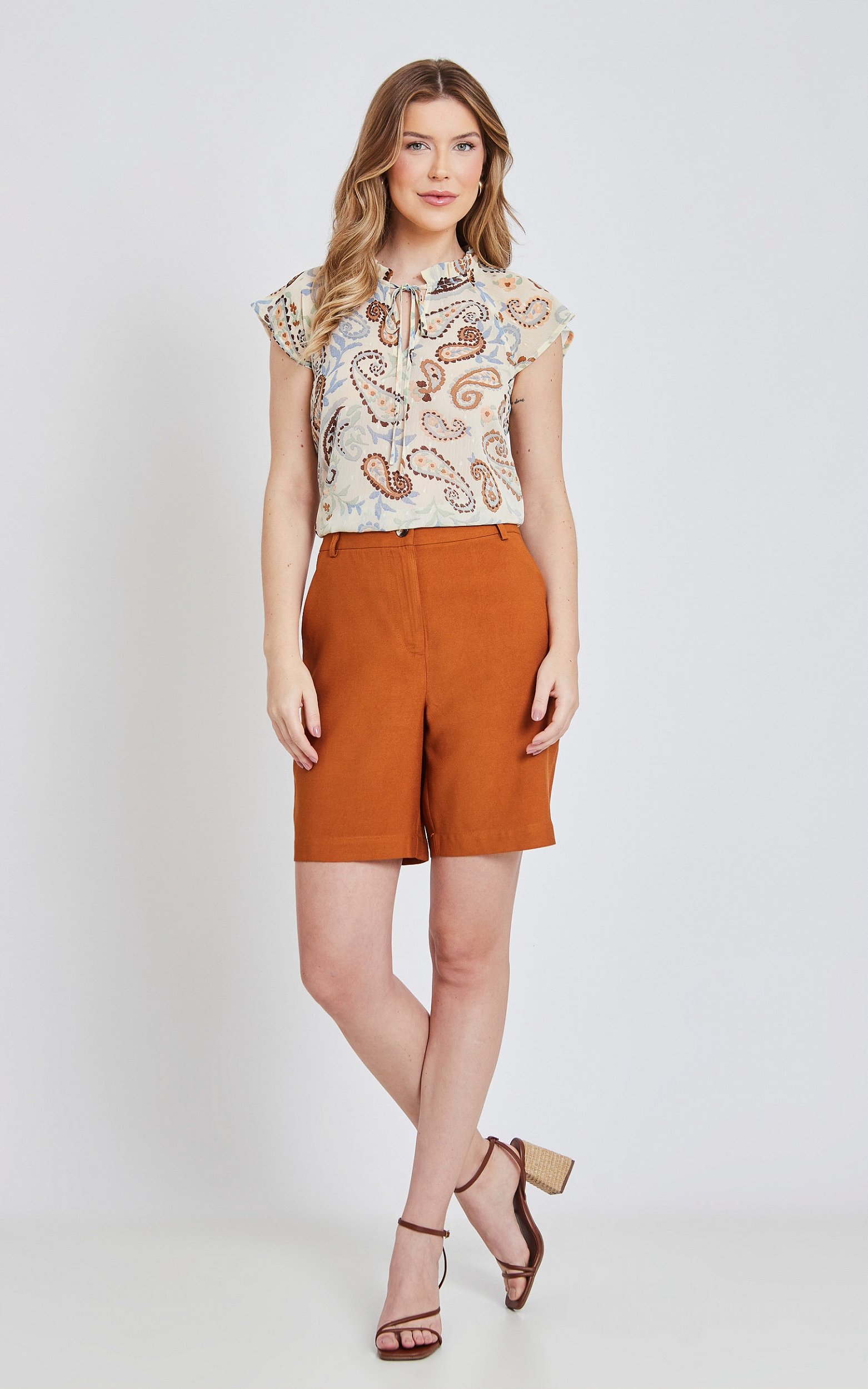 A bermuda de alfaiataria é a tradução do estilo versátil e atemporal. Com fechamento por zíper e botão, bolsos faca e traseiros invisíveis, além de passantes para cinto, une praticidade e sofisticação. Seu caimento levemente soltinho garante conforto e elegância em produções que equilibram modernidade e refinamento.