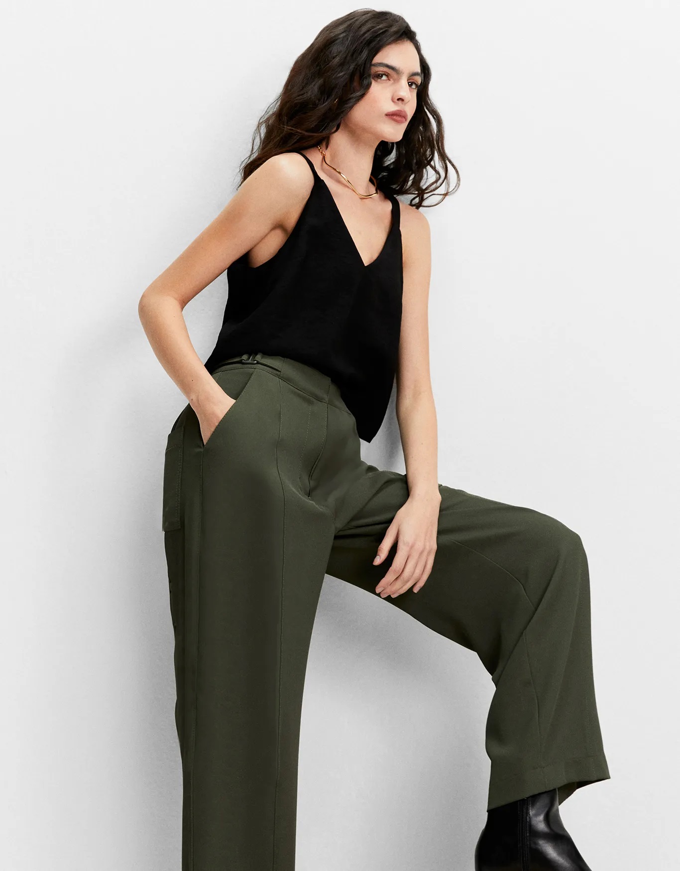 • Fechamento vista com zíper de metal, botão interno e ganchos