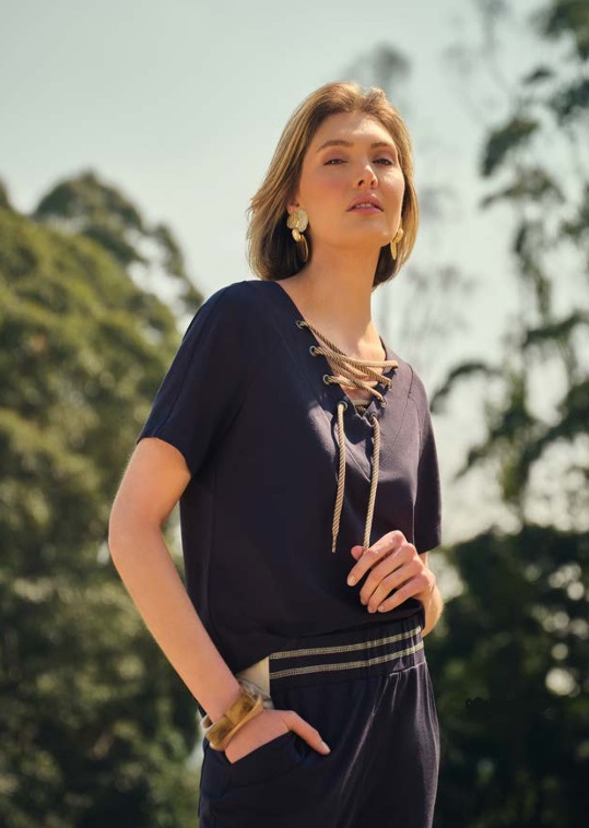 Descubra a elegância casual da nova coleção Eliana Maza com este conjunto moderno e confortável. A blusa em tom escuro traz detalhe trançado no decote, conferindo um toque sofisticado e feminino ao visual. Feita em tecido leve, garante caimento perfeito e conforto durante todo o dia.