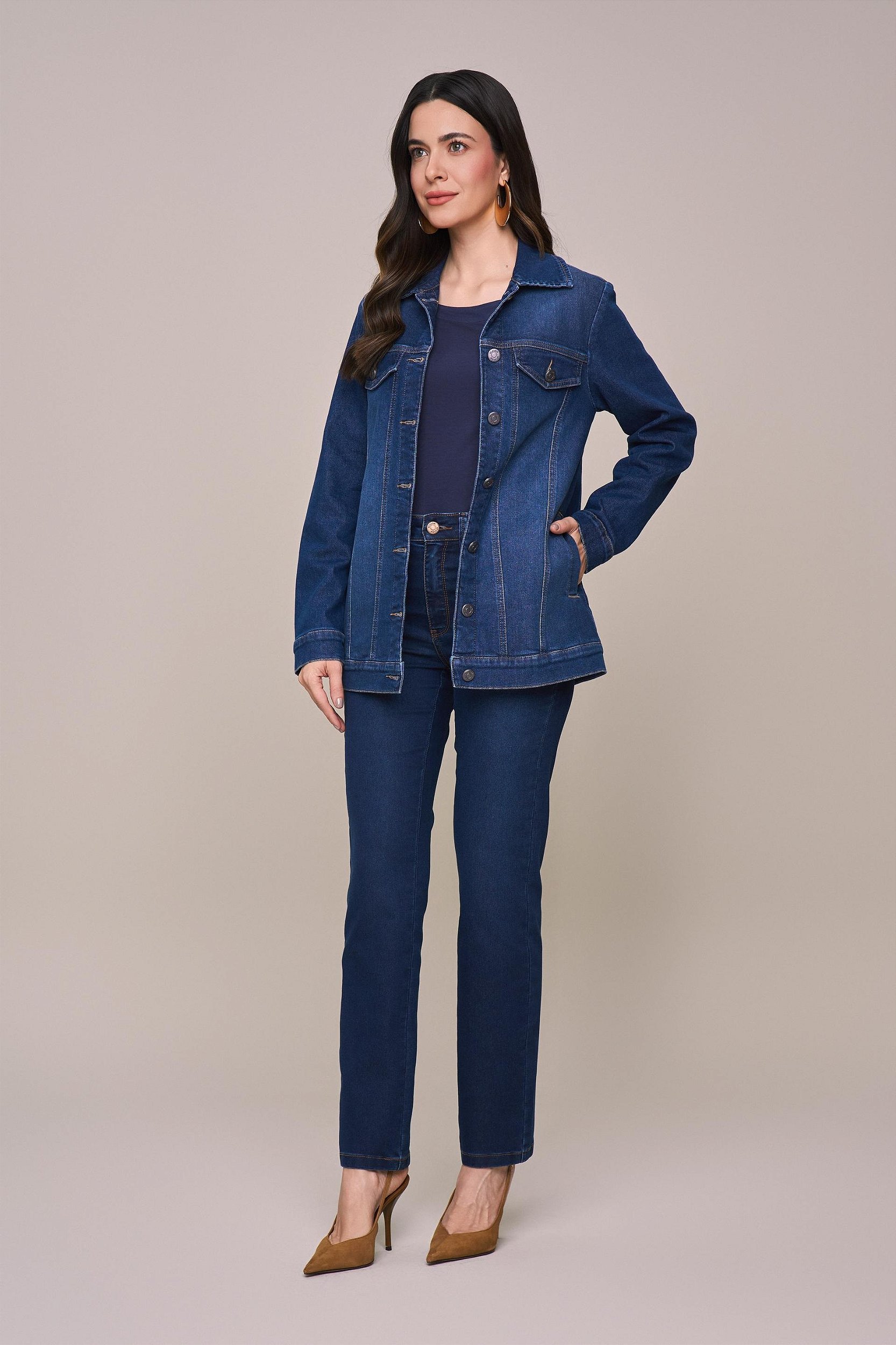 jaqueta jeans manga longa forrada solta ao corpo jeans leve bolsos laterais use para um look casual .