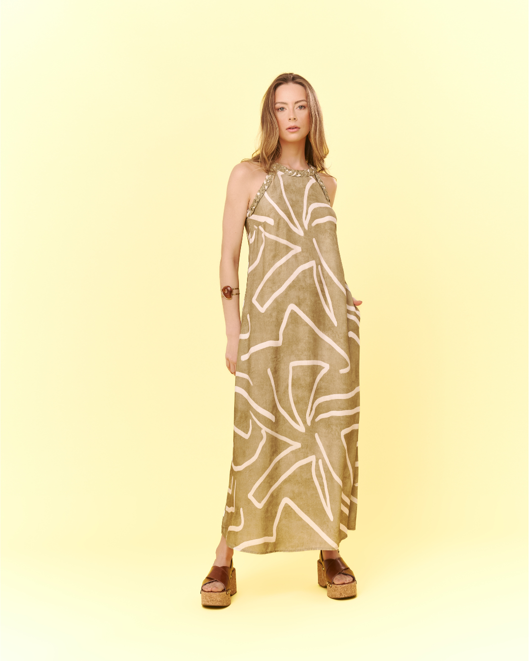 O vestido longo verde da Eliana Maza Moda é a tradução perfeita de leveza e sofisticação natural. Confeccionado em tecido leve e fluido, apresenta uma estampa orgânica moderna em tons neutros, que transmite elegância com um toque contemporâneo.