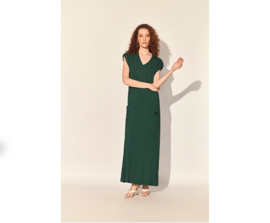 Vestido longo verde da Reserva Natural, com decote V e modelagem fluida que garante conforto e elegância. Detalhe que lembra bolsos frontais com detalhe em botão trazem charme funcional. Ideal para um look casual sofisticado no dia a dia ou ocasiões especiais.