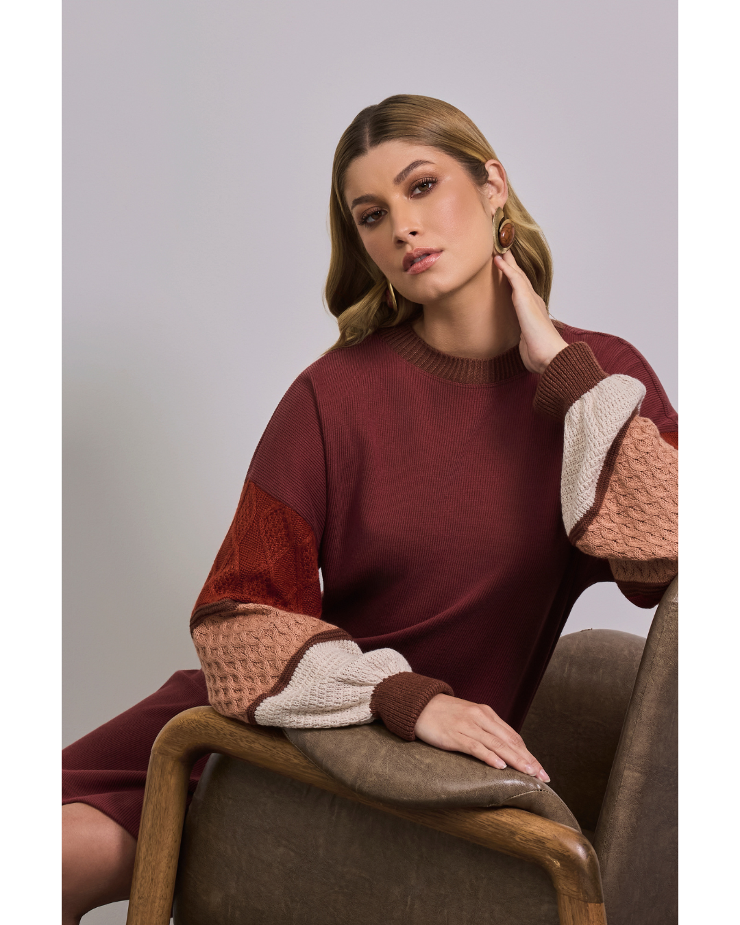O destaque fica por conta das mangas com mix de texturas e cores, que combinam diferentes pontos de tricô e criam um visual moderno e diferenciado. Versátil, é perfeito para composições que transitam do casual ao sofisticado com facilidade.